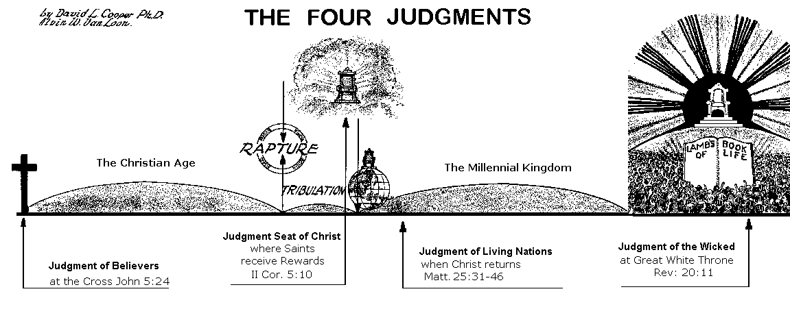 In Psalm 40 David foretold that God would no longer accept animal sacrifices, and that He would prepare a body for the Messiah to assume in order that by His sacrificial death He might do the will of God. (Read Psalm 40 and its interpretation found in Hebrews 10:1-18.) According to this prediction, Christ in His body did the will of God with reference to the sin question. It is, therefore, "by which will we have been sanctified through the offering of the body of Jesus Christ once for all" (Heb. 10:10). Furthermore, it is "by one offering that He has perfected forever them that are sanctified" (Heb. 10:14). Christ, in His death, satisfied the justice of God and paid the penalty for my sins. When I accept Him, His righteousness is imputed to me and God views me through the perfect righteousness of the Lord Jesus. By the one offering of Himself, He has perfected forever those who come unto God by Him. The cross, therefore, was the first judgment. Those who therefore accept the Christ of the cross will never come into judgment to be tried concerning salvation. THE JUDGMENT SEAT OF CHRIST"For we must all be made manifest before the judgment-seat of Christ; that each one may receive the things done in the body, according to what he hath done, whether it be good or bad. Knowing therefore the fear of the Lord, we persuade men, but we are made manifest unto God; and I hope that we are made manifest also in your consciences" (II Cor. 5:10,11). When we appear before the judgment seat of Christ, we shall not be judged with reference to our sins, for they are all washed away in the blood of the Lamb. Men are saved by the grace of God; that is, by accepting His grace and the atoning work of the Lord Jesus Christ; but they are to be rewarded according to their deeds. For instance, our Lord according to Matthew 16:27 declared that, when He returns, He will render unto every man according to his deeds. This thought is expressed repeatedly by the sacred writers.