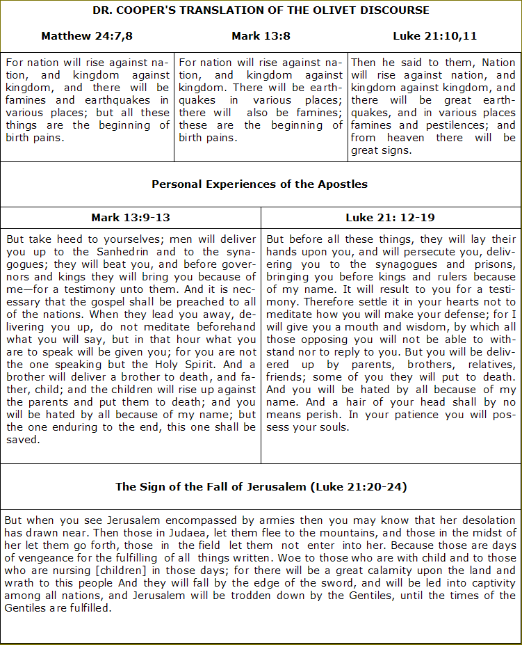 In Luke, vss. 10 and 11, Jesus takes the minds of the apostles from their own day to the signs of the end of the age--a world war attended by famines, pestilences and great earthquakes in diverse places. As we proceed in this investigation we shall see that our Lord had such passages as Zech. 14 in His mind when He foretold the destruction of Jerusalem. The awful horrors revealed in that chapter necessarily will involve great suffering by the people of God who are on earth during the day of Jehovah--the Tribulation Period.