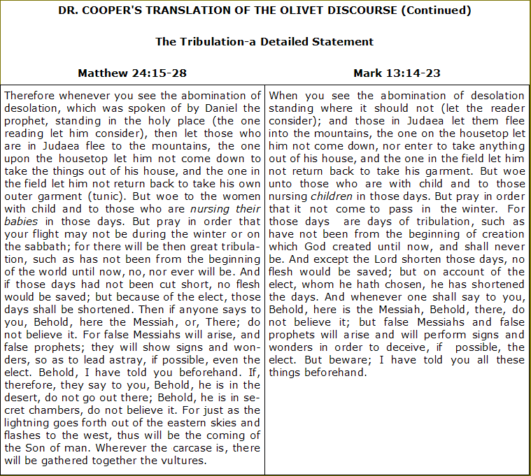 Two similar predictions in the Olivet Discourse: In Matt. 24:16-19 our Lord emphasized the necessity for speedy flight from Jerusalem and its environs immediately upon receipt of the news that the image is set up in the Temple. In giving these instructions His heart went out to the poor, unfortunate mothers and those expecting who would, under such circumstances, be hindered from a hasty departure.