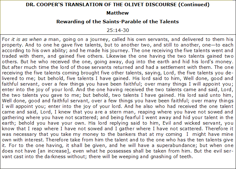 In the discussion of the Rapture of the Church, we have already seen that the parable of the virgins is illustrative of that event. This fact was seen by the force of the adverb then introducing 25:1. In that discussion we also saw that the "kingdom of heaven" is a broad, comprehensive term including all Christendom. The conjunction for introducing the parable of the talents links this discussion with the parable of the virgins and the teaching concerning the Rapture of the Church, set forth in 24:32f.